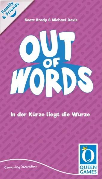 Queen Games (2026)In Out of Words versucht ihr gemeinsam als Team so viele Begriffe wie möglich zu erraten. Die Regeln in drei Schritten erklärt: Der Wortgeber zieht eine Karte und bekommt ein Wort zugeordnet, das vom Team erraten werden muss. Der Wortgeber sucht sich einen Buchstaben aus dem Buchstabenraster aus, bildet ein Hinweis-Wort und gibt es den Mitspielenden. Die Mitspielenden versuchen mit Hilfe des Hinweis-Worts das gesuchte Wort zu erraten.