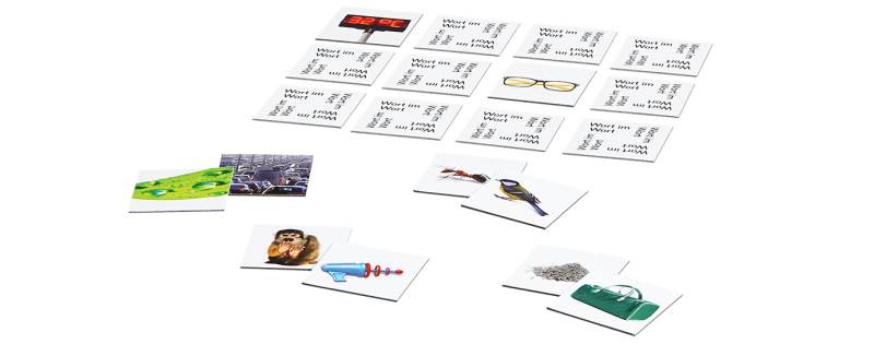 Dieses besondere Memo hat es ganz schön in sich. Es geht nämlich nicht darum, zwei völlig gleiche Bildplättchen zu finden, sondern jene mit – wie der Name schon verrät – Wort im Wort. Ein Paar gehört also nur dann zusammen, wenn der Begriff des einen komplett im zweiten vorkommt, wie beispielsweise „Ass“ in „Fass“.
