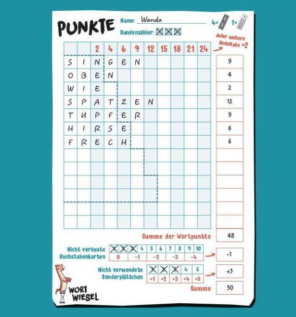 Das Spiel endet nach drei Runden. Je mehr Buchstaben ein Wort hat, desto mehr Punkte gibt es dafür. Für nicht verbaute Karten gibt es Punktabzug, für nicht genutzte Sonderplättchen gibt es Bonuspunkte.