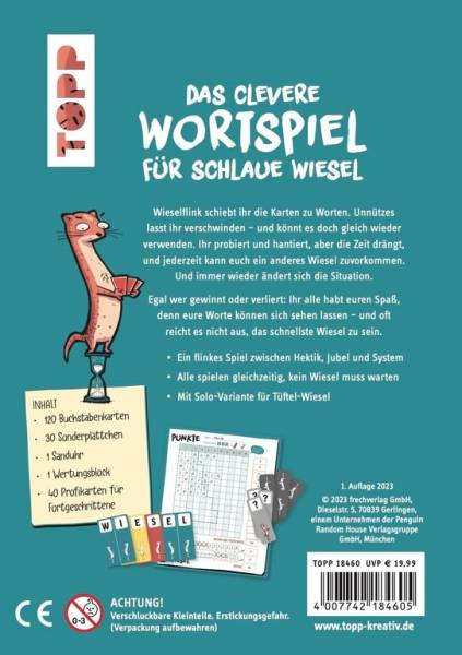 Macht fette Buchstaben Beute! Als Wortwiesel wollt ihr aus Karten mit Buchstabenpaaren Wörter bilden. Beachtet aber die Farben der Karten und die Bauregeln. Nur fertige Wörter werden mit Punkten belohnt. Und mitunter kommen die Karten schneller, als man sie brachen kann ...Â