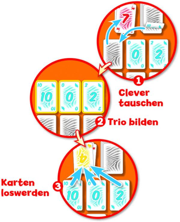 Ordne drei Karten mit gleicher Farbe oder Zahl in deiner Auslage so an, wie Streifen auf einem Zebra sind: längs, quer oder schräg. Dann bilden diese Karten ein Trio und du darfst sie abwerfen.