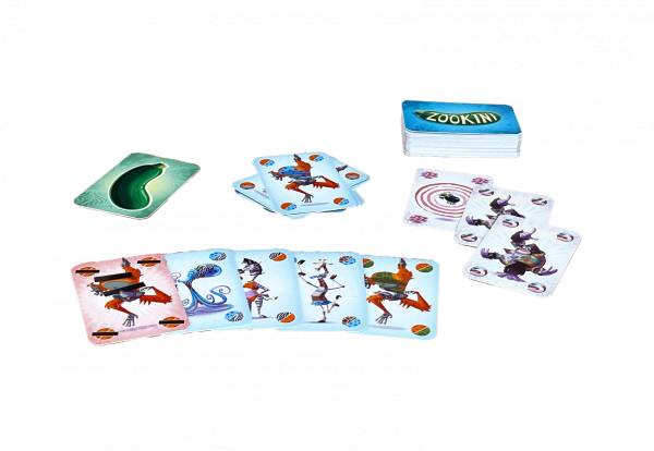 Zookini - das schnelle Kartenablegespiel nach " Mau-Mau-Prinzip "; hier mit lustigen Zoobewohnern in bunten Bikinis; wer wird seine Karten am schnellsten los ?
